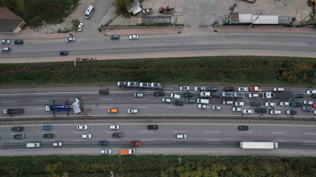 Anadolu Otoyolu Sakarya geçişinde SUV tarzı araç yüklü tır ile çarpışan nakliyat kamyoneti devrildi. Kazada yaralanan olmazken, otoyolun Ankara istikametinde kilometrelerce araç kuyruğu oluştu.