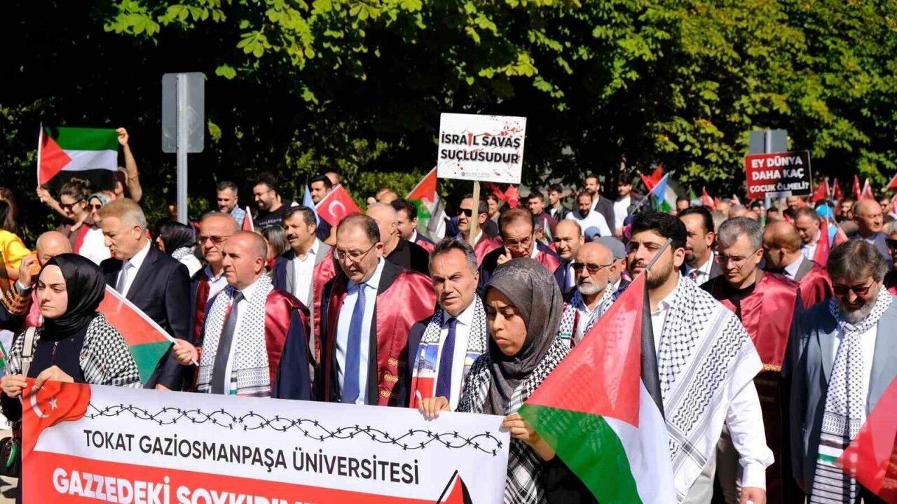 Tokat Gaziosmanpaşa Üniversitesi öğrencileri ve akademisyenleri, Gazze’deki soykırımın 2’nci yılı dolayısıyla "Özgürlüğe yürüyoruz" sloganıyla düzenlenen yürüyüşte barış, adalet ve özgürlük çağrısında bulundu.