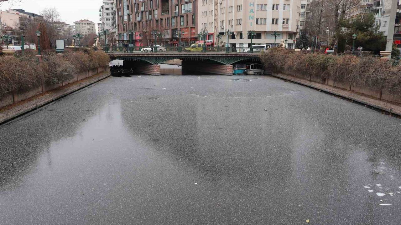 Eskişehir'de Porsuk Çayı'nın buz tutan yüzeyindeki atık maddeler kötü görüntü oluşturdu.