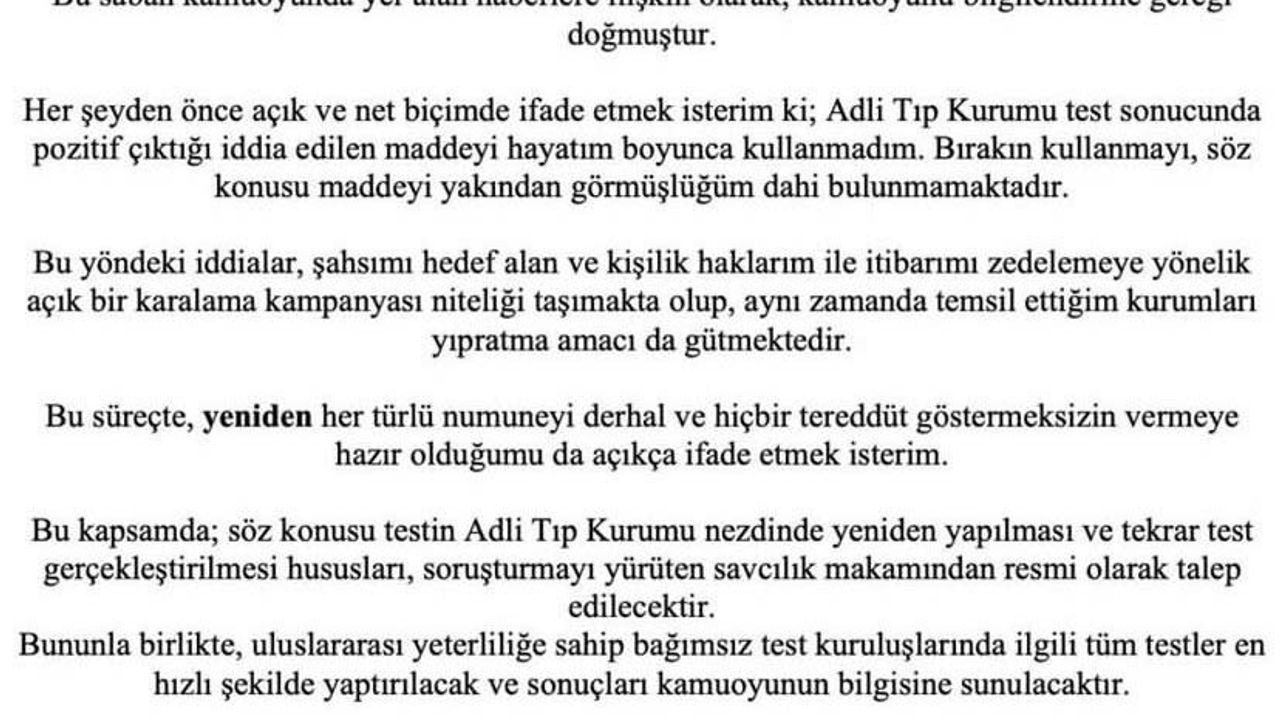 Test sonucunun pozitif çıkmasının ardından sosyal medya hesabından açıklama yapan Saran, 'Bu sabah kamuoyunda yer alan haberlere ilişkin olarak, kamuoyunu bilgilendirme gereği doğmuştur. Her şeyden önce açık ve net biçimde ifade etmek isterim ki; Adli Tıp Kurumu test sonucunda pozitif çıktığı iddia edilen maddeyi hayatım boyunca kullanmadım. Bırakın kullanmayı, söz konusu maddeyi yakından görmüşlüğüm dahi bulunmamaktadır. Bu yöndeki iddialar, şahsımı hedef alan ve kişilik haklarım ile itibarımı zedelemeye yönelik açık bir karalama kampanyası niteliği taşımakta olup, aynı zamanda temsil ettiğim kurumları yıpratma amacı da gütmektedir. Bu süreçte, yeniden her türlü numuneyi derhal ve hiçbir tereddüt göstermeksizin vermeye hazır olduğumu da açıkça ifade etmek isterim. Bu kapsamda; söz konusu testin Adli Tip Kurumu nezdinde yeniden yapılması ve tekrar test gerçekleştirilmesi hususları, soruşturmayı yürüten savcılık makamından resmi olarak talep edilecektir. Bununla birlikte, uluslararası yeterliliğe sahip bağımsız test kuruluşlarında ilgili tüm testler en hızlı şekilde yaptırılacak ve sonuçları kamuoyunun bilgisine sunulacaktır. Bir kez daha ve özellikle vurgulamak isterim ki; gerçeğin bilimsel yöntemlerle, evrensel standartlara uygun biçimde ortaya konulmasından hiçbir çekincem bulunmamaktadır. Öte yandan, hakkında gizlilik karan bulunan bir dosyaya ait olduğu belirtilen bilgilerin, test sonucunun çıktığı iddia edilen sabahın ilk saatlerinden itibaren eş zamanlı ve koordineli bir şekilde bazı mecralarda yayımlanmış olması ayrıca dikkatle değerlendirilmesi gereken ciddi bir durumdur. Gerçeğin er ya da geç ortaya çıkacağına; sürecin hukuk devleti ilkeleri çerçevesinde, adil ve şeffaf biçimde sonuçlanacağına olan inancım tamdır' ifadelerini kullandı.