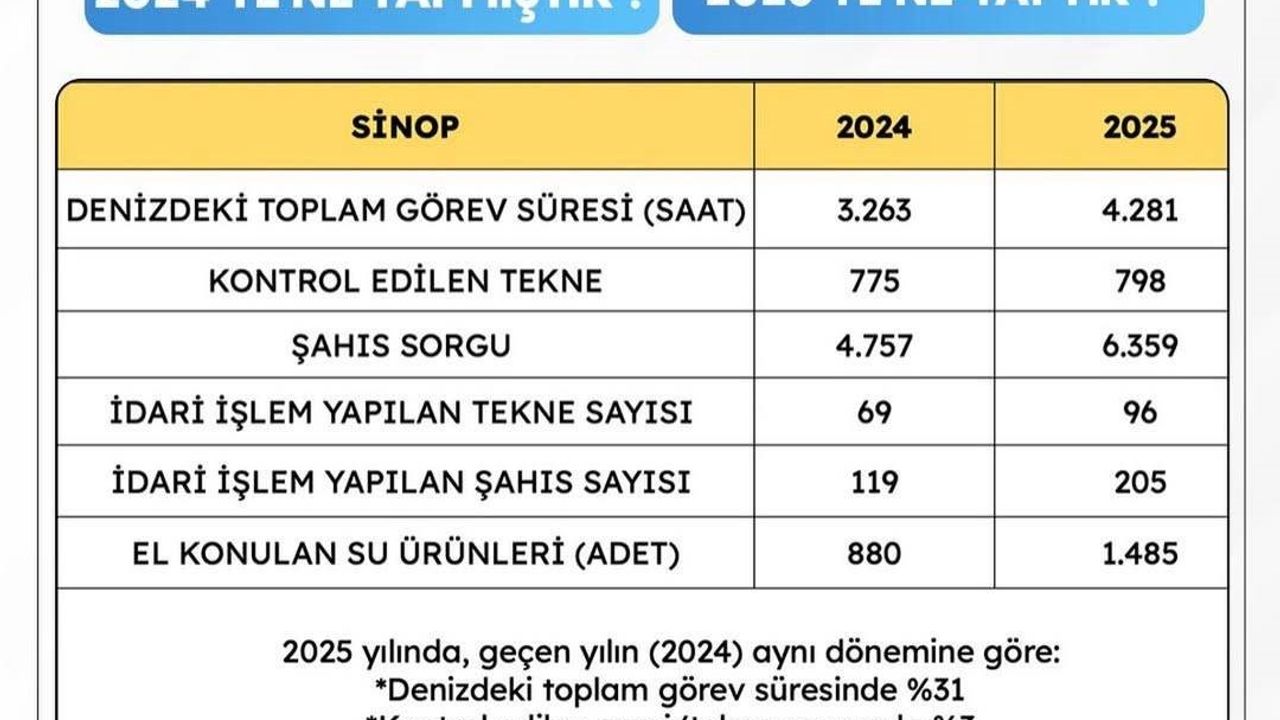 Sinop Valiliği, Sahil Güvenlik Karakol Komutanlığı tarafından 2024-2025 yıllarına ait faaliyet verilerini kamuoyuyla paylaştı.