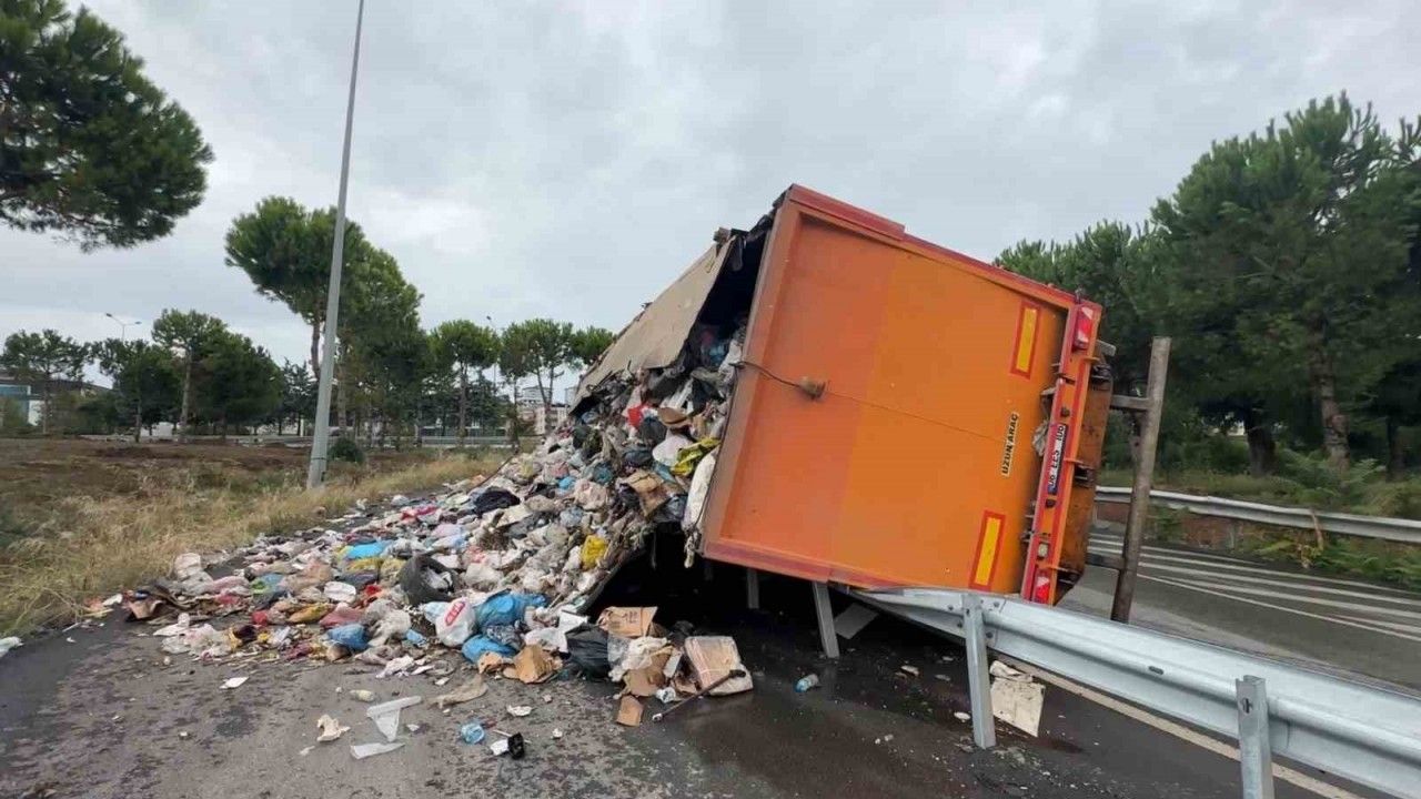 Samsun’da çöp yüklü bir tır, virajı alamayarak bariyerlere çarpıp devrildi. Kazanın ardından çöpler yola ve refüje savruldu, çevrede kötü koku oluştu.