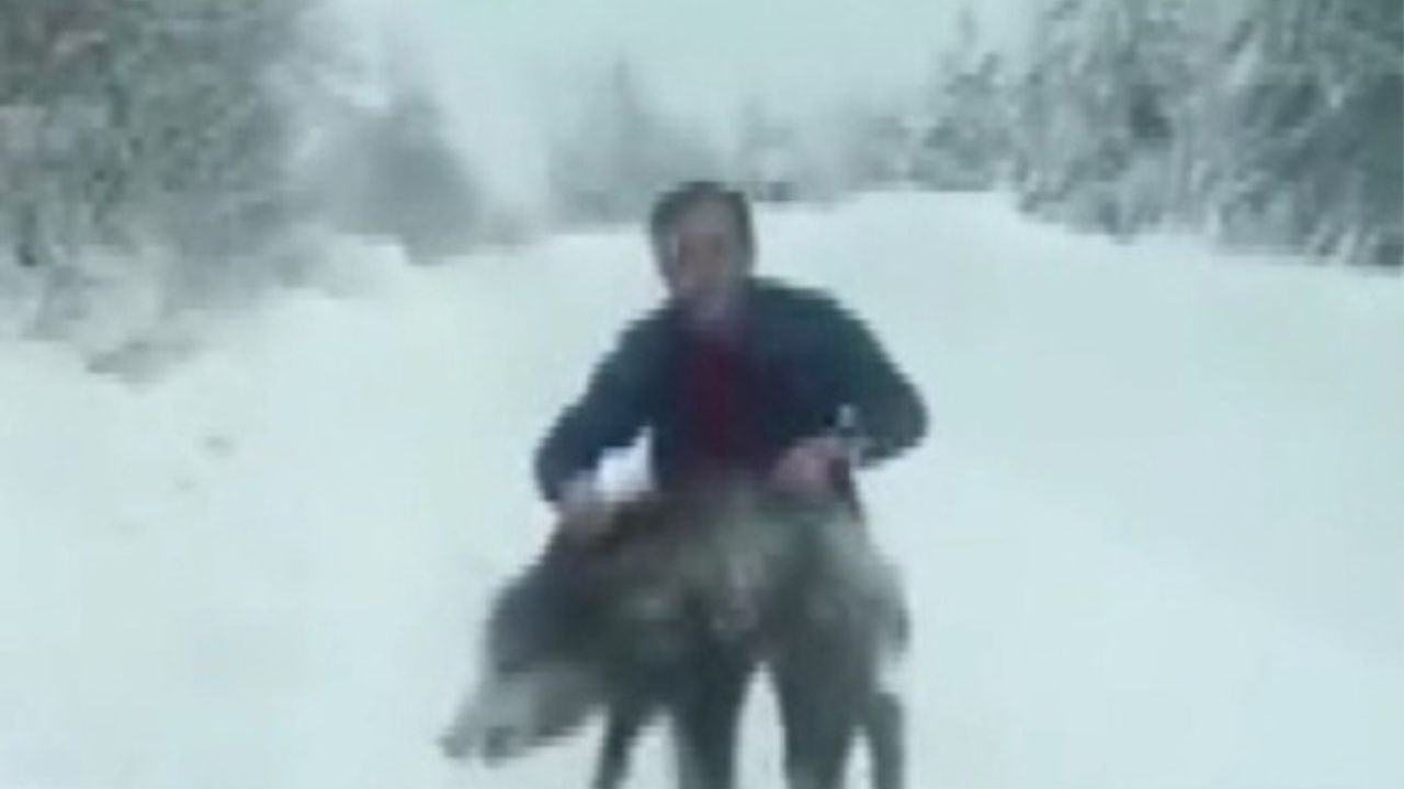 Sinop'un Erfelek ilçesinde karlı yolda ilerleyen bir araç yaban domuzu sürüsü ile karşı karşıya geldi. Araçtan inip yaban domuzunu kovalayan bir vatandaş hayvanı eliyle yakalayıp geri bıraktı. O anlar telefon kamerasına yansıdı.