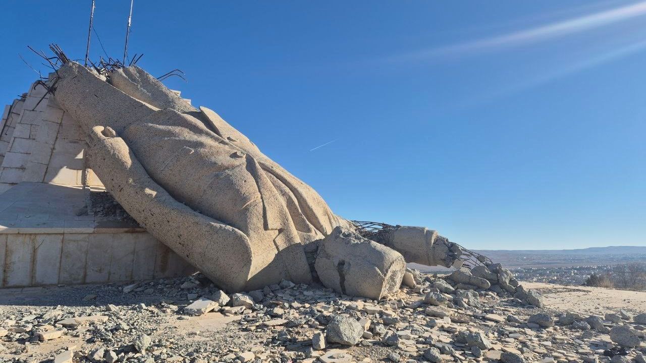Suriye'de geçtiğimiz yıl Esad rejiminin yıkılmasının ardından Şam'ın yaklaşık 88 kilometre kuzeyinde bulunan ve 'Heykel Tepesi' olarak bilinen noktaya iş makineleriyle çıkan halkın devirdiği Hafız Esad'ın ülkedeki en büyük heykeli hale devrik halde bulunuyor.