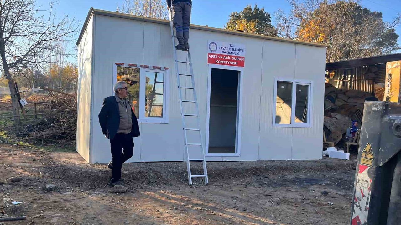 Denizli'nin Tavas ilçesinde elektrik hattından çıkan yangında evleri kullanılamaz hale gelen Fırlayış ailesine Tavas Belediyesi tarafından geçici barınmayı sağlamak için konteyner ev desteği verildi.