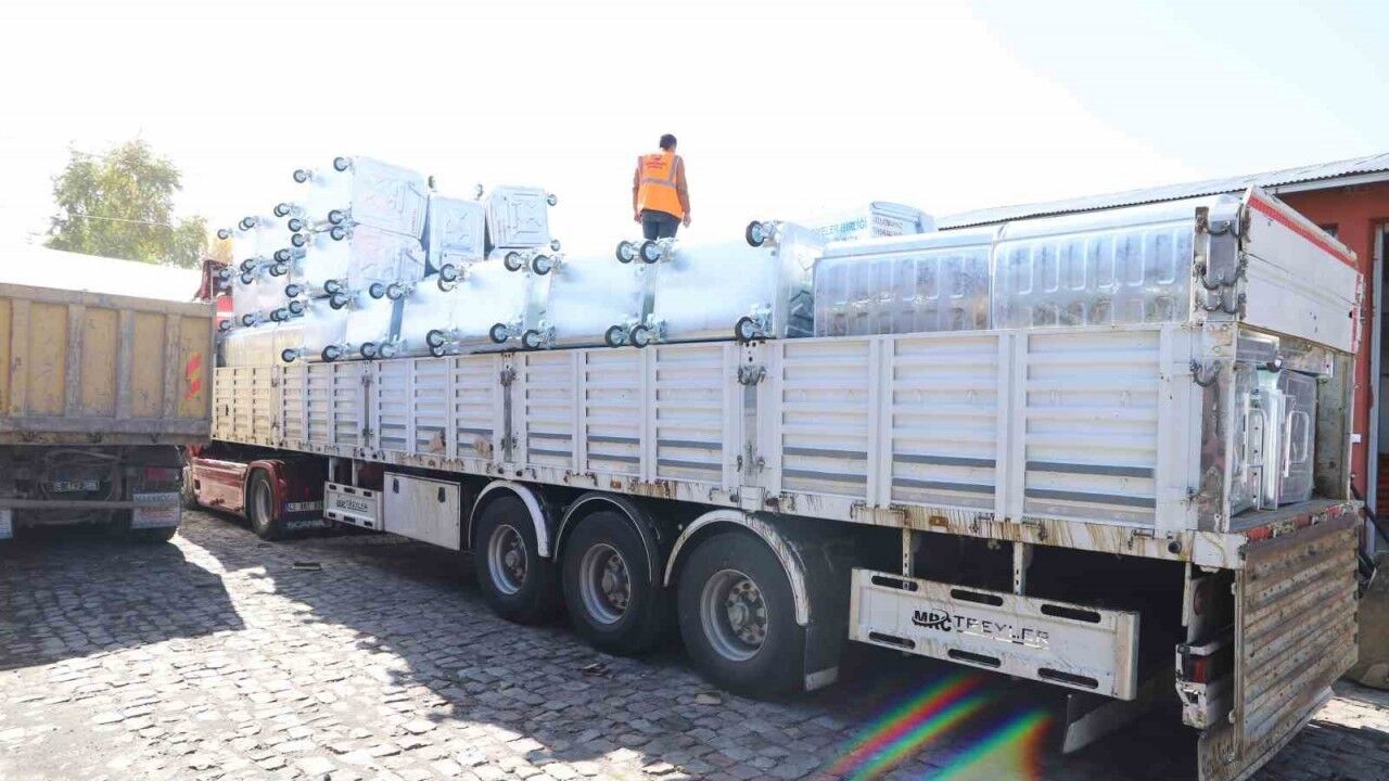 Hibe edilen 100 adet yeni çöp konteynerleri, belediye kademe hizmet binası içerisinde teslim alındı ardından kentin ihtiyaç duyulan her yerine dağıtılmaya başlandı.