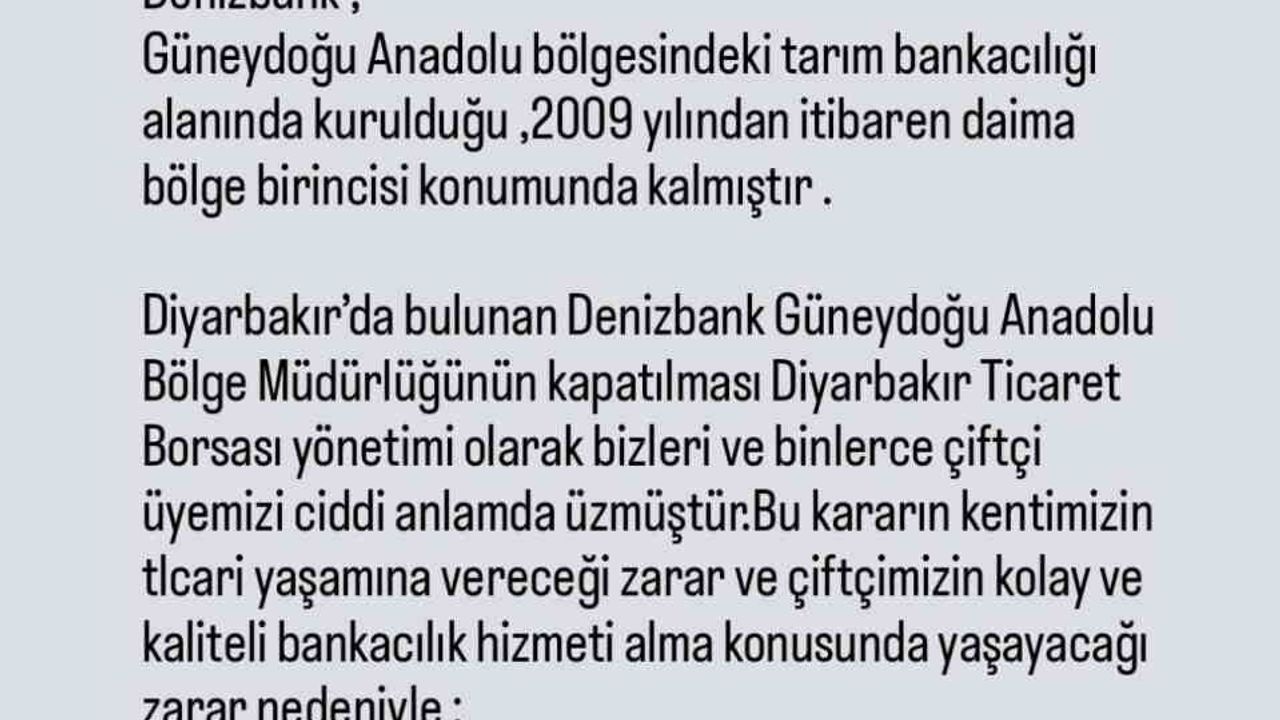 Diyarbakır Ticaret Borsasından yapılan açıklamada, "2009 yılında Diyarbakır’da kurulan Denizbank Güneydoğu Anadolu Bölge Müdürlüğü, özelde kentimizin ve genelde de bölgemizin tarımına değerli hizmetler vermiş ve bölge tarımının gelişimine önemli katkılar sağlamıştır. Bu hizmetlere karşılık olarak çiftçilerimiz Denizbank Güneydoğu Anadolu Bölge Müdürlüğü şahsında Denizbank’a oldukça önemli teveccüh göstermiş ve bunun sonucu olarak Denizbank Güneydoğu Anadolu Bölgesindeki tarım bankacılığı alanında kurulduğu, 2009 yılından itibaren daima bölge birincisi konumunda kalmıştır. Diyarbakır’da bulunan Denizbank Güneydoğu Anadolu Bölge Müdürlüğünün kapatılması Diyarbakır Ticaret Borsası yönetimi olarak bizleri ve binlerce çiftçi üyemizi ciddi anlamda üzmüştür. Bu kararın kentimizin ticari yaşamına vereceği zarar ve çiftçimizin kolay ve kaliteli bankacılık hizmeti alma konusunda yaşayacağı zarar nedeniyle Denizbank Güneydoğu Anadolu Bölge Müdürlüğünün kapatılması kararının geri alınarak Diyarbakır’a ve bölgemize kaldığı yerden hizmet vermeye devam etmesini Diyarbakır Ticaret Borsası Yönetimi ve binlerce çiftçimiz adına talep ediyoruz" denildi.