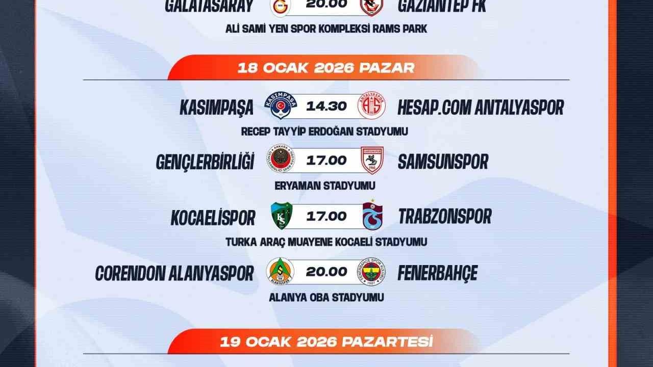 Trendyol Süper Lig'de 18. ve 19. haftalarda oynanacak müsabakaların programı belli oldu. TFF'nin sitesinden yapılan açıklamaya göre, söz konusu haftaların programı şu şekilde: