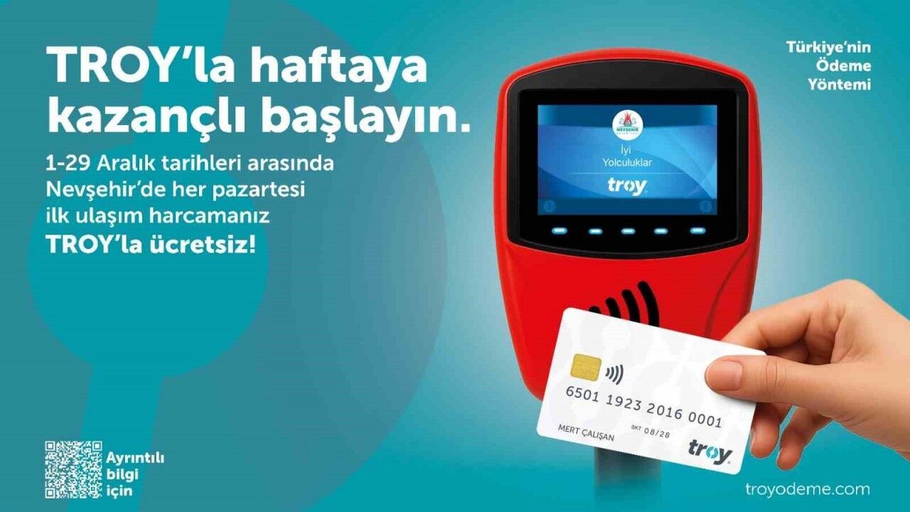 Nevşehir Belediyesi Zabıta Müdürlüğü; Aralık ayında toplu taşıma kullanıcılarına yönelik yeni bir kampanya başlatıldığını duyurdu. Buna göre, 1-29 Aralık 2025 tarihleri arasında pazartesi günleri, Nevşehir Belediyesi’ne bağlı şehir içi toplu taşıma hatlarında TROY logolu temassız kartlarla yapılan ilk ulaşım ödemesi ücretsiz olacak. Bankalar arası Kart Merkezi (BKM) tarafından TROY kullanıcılarına özel olarak başlatılan kampanya kapsamında vatandaşlara ’Haftaya Kazançlı Başlayın’ çağrısı yapıldı. Kampanya çerçevesinde TROY logolu temassız özellikli banka ve kredi kartları, ön ödemeli kartlar ile mobil ödeme (NFC) yöntemleri ücretsiz geçiş için kullanılabilecek. Her pazartesi günü sadece bir kez uygulanacak ücretsiz geçiş sırasında, ödeme ekranında tutar görünecek ancak bu ücret kart sahibine yansıtılmayacak. Ödeme, BKM (TROY) tarafından karşılanacak. Kampanyadan yararlanmak için vatandaşların herhangi bir başvuru yapmasına gerek olmadığı belirtildi. Ücretsiz geçiş uygulamasının sadece Nevşehir Belediyesi toplu taşıma hatlarında geçerli olacağı ifade edildi.