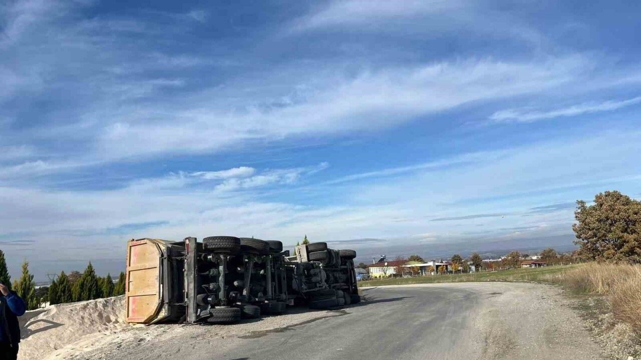 Uşak’ta yan yatan tırın sürücüsü yaralanarak hastaneye kaldırıldı.