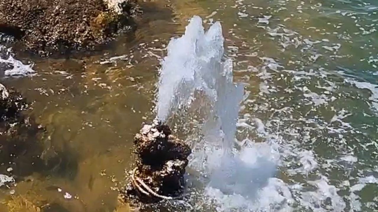 Van Gölü’nün çekilmesiyle Gevaş’ta gün yüzüne çıkan bir mikrobiyalitte fışkırır şekilde görülen su çıkması, görenleri hayrete düşürüyor.