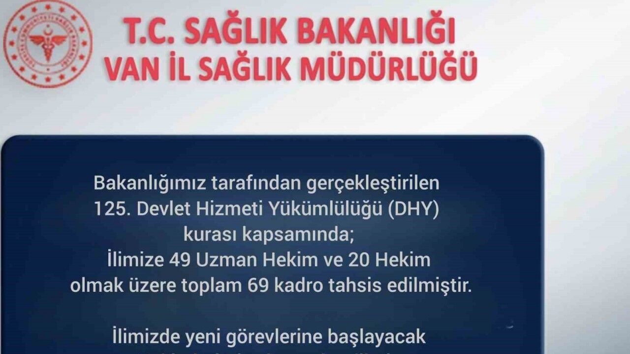 Sağlık Bakanlığınca gerçekleştirilen 125. Devlet Hizmeti Yükümlülüğü (DHY) Kurası kapsamında, Van’a 49 uzman hekim ve 20 hekim olmak üzere toplam 69 yeni kadro tahsis edildi.