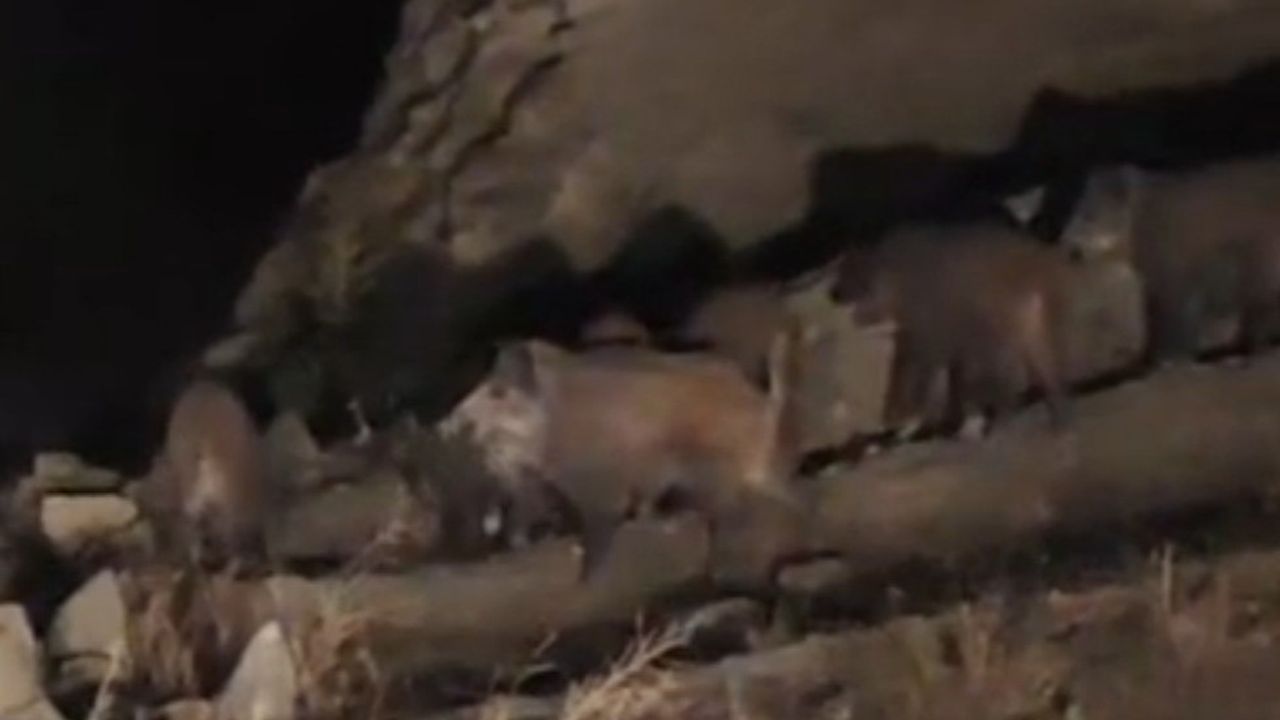 Başkale ilçesine 50 kilometre uzaklıkta bulunan İran sınırındaki kırsal Esenyamaç Mahallesi’ne akşam saatlerinde yaban domuzu sürüsü indi. Mahallede ikamet eden Mustafa Özdemir, yolun kenarında yiyecek arayan sürüyü cep telefonu kamerasıyla görüntüledi. Yaklaşık 10 domuzun bulunduğu sürü, yolun karşısına geçtikten sonra gözden kayboldu.