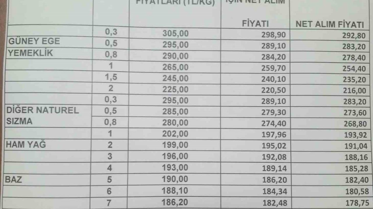 Türkiye'nin önemli tarım kentlerinden olan Aydın'da zeytinde sezonu hareketliliği sürerken, zeytinyağı fiyatları da açıklandı. Tariş Zeytin ve Zeytinyağı Birliği tarafından açıklanan fiyatlara göre; yemeklik yağlarda 0,3 asit 305 TL, 0,5 asit 295, 0,8 asit 290 TL, 1 asit 265 TL, 1,5 asit 245 TL, 2 asit 225 TL olarak açıklandı. Diğer naturel sızma yağlarda ise; 0,3 asit 295 TL, 0,5 asit285 TL, 0,8 Asit 280 TL, 1 asit ham yağ ise 202 TL olarak açıklandı.
